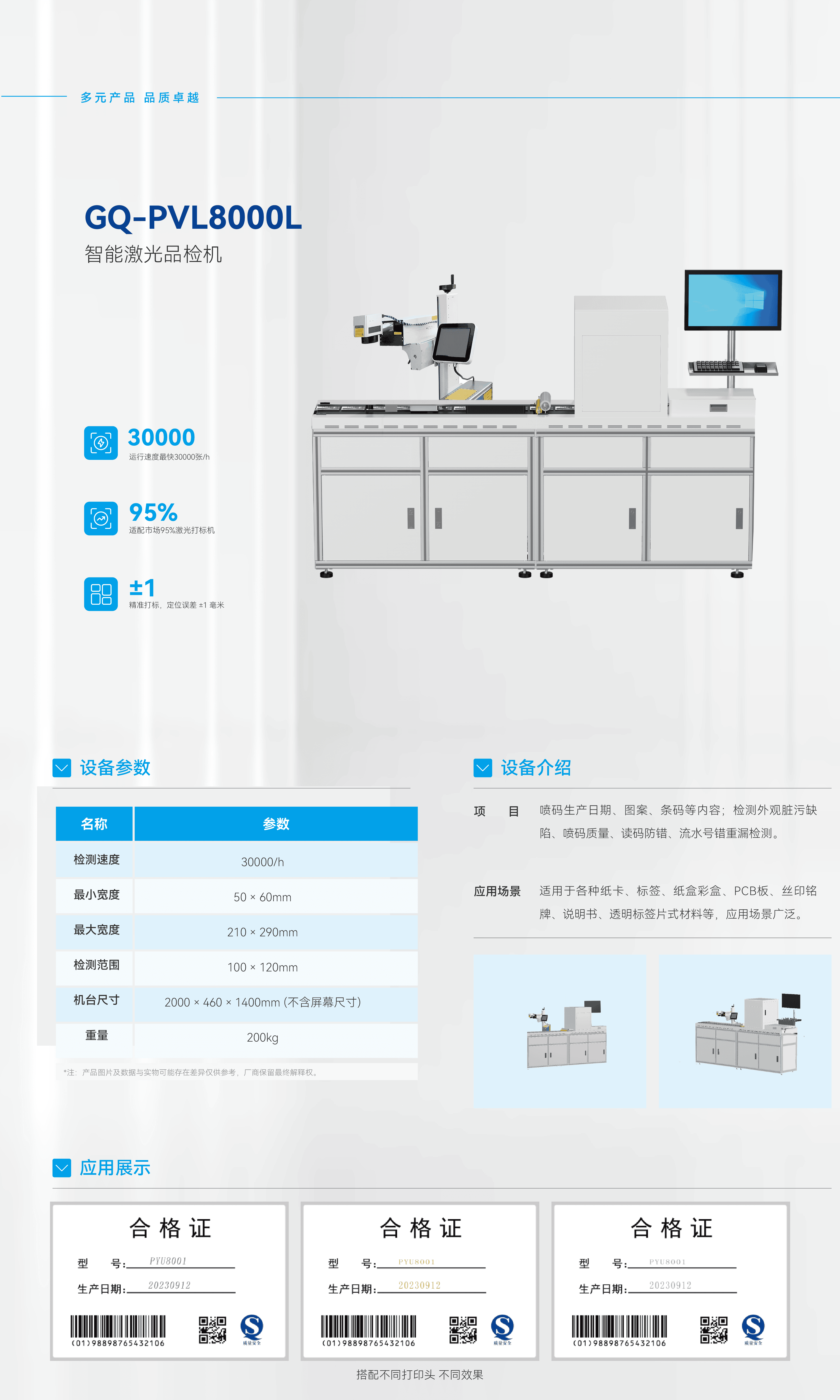 GQ-PVL8000L智能激光品檢機(jī)具備多重核心功能,覆蓋從噴碼到檢測(cè)的全流程:
